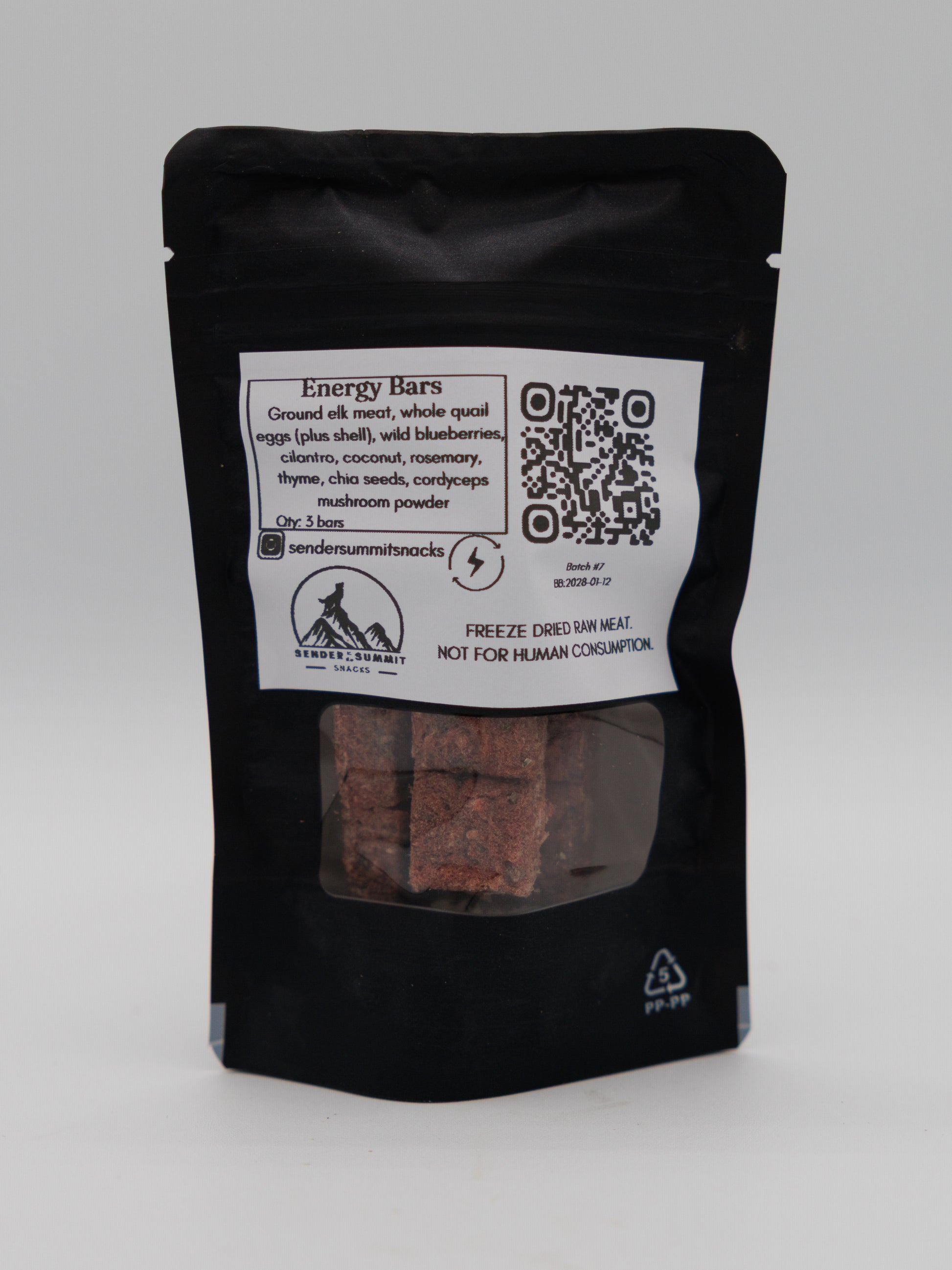 Ingrédients : Viande de wapiti hachée, œufs de caille entiers (plus coquille), bleuets sauvages, coriandre, romarin, thym, graines de chia, poudre de champignon cordyceps