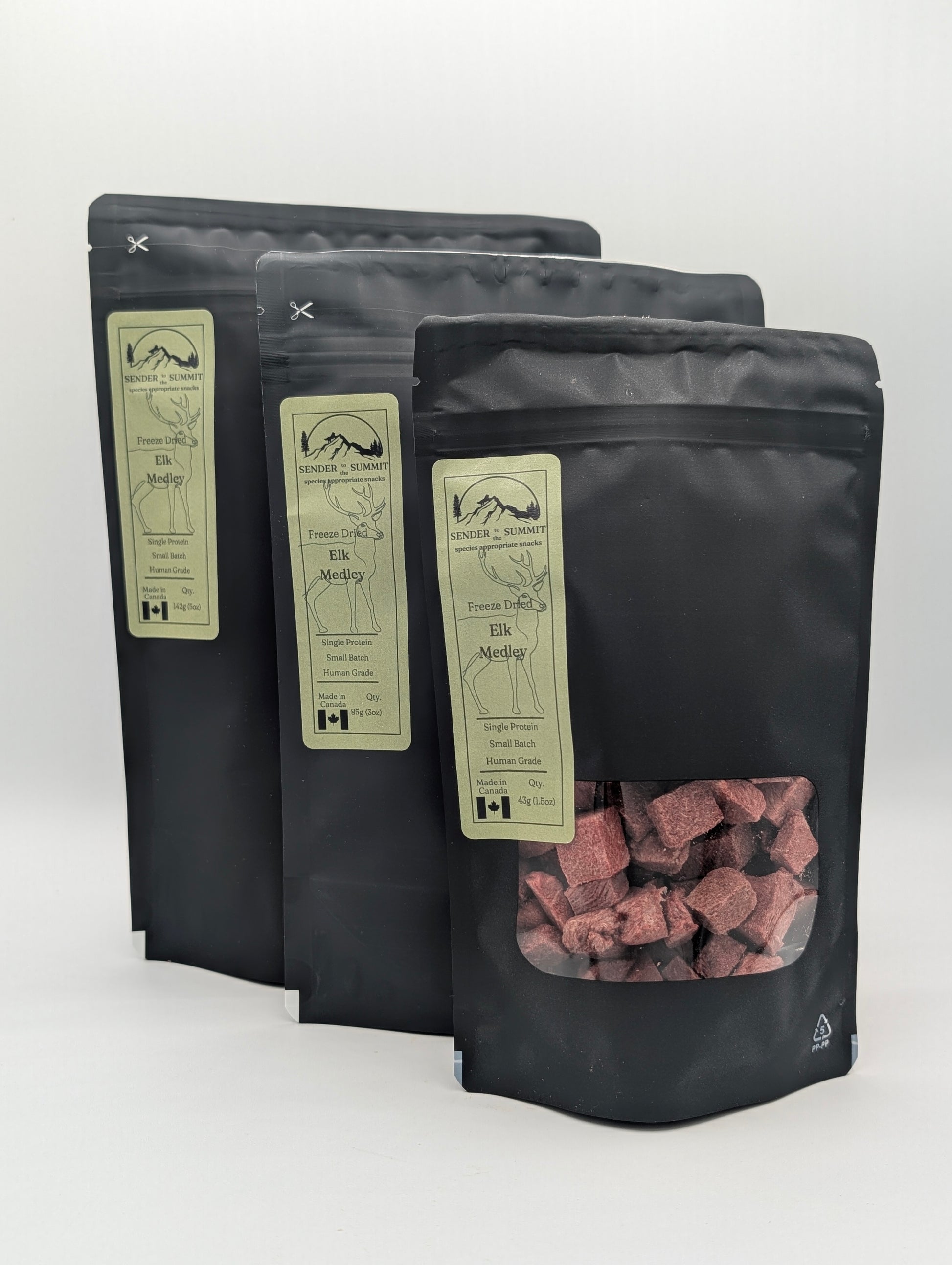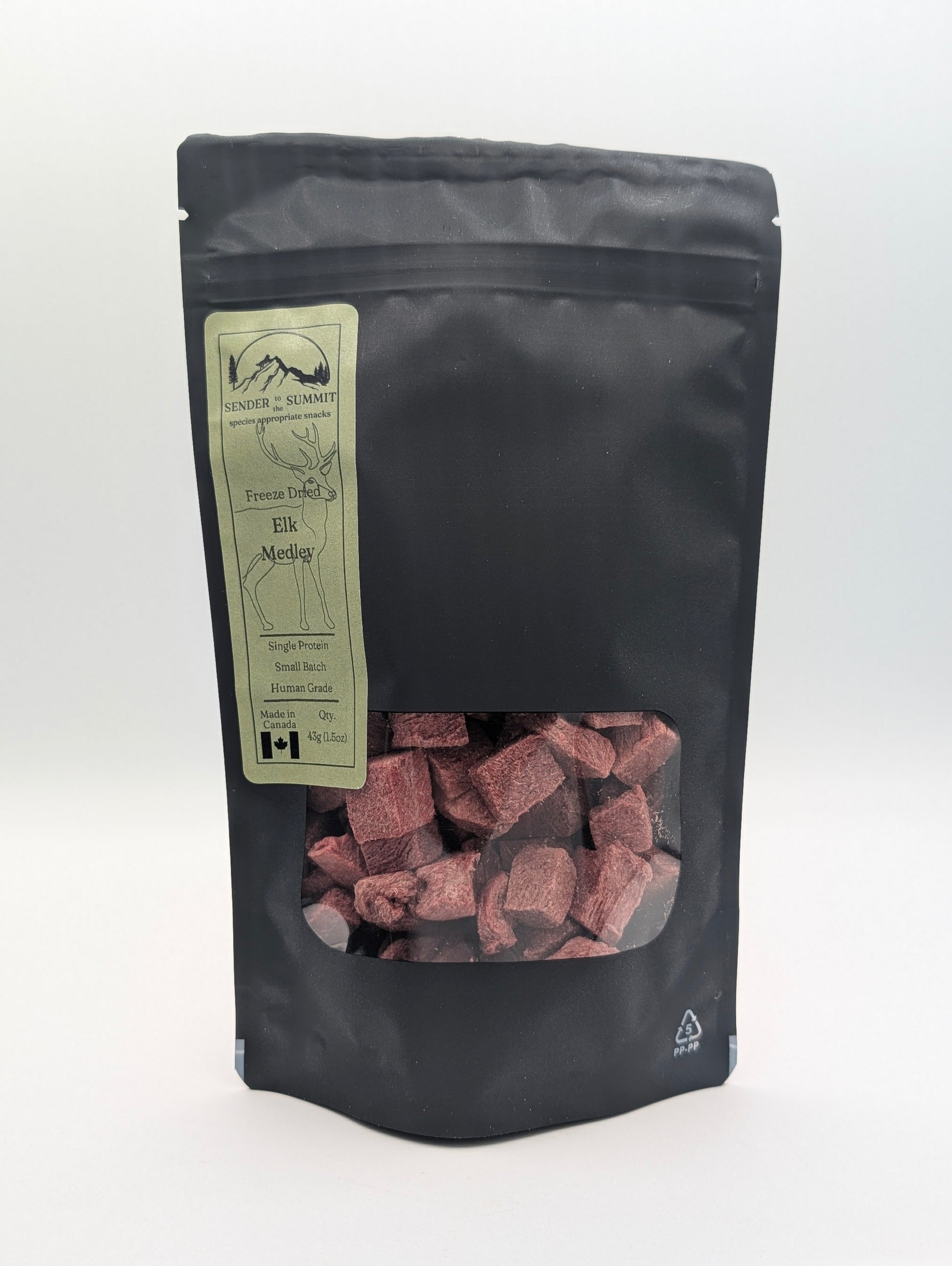 Freeze dried raw bite sized slices of elk meat for your pets!