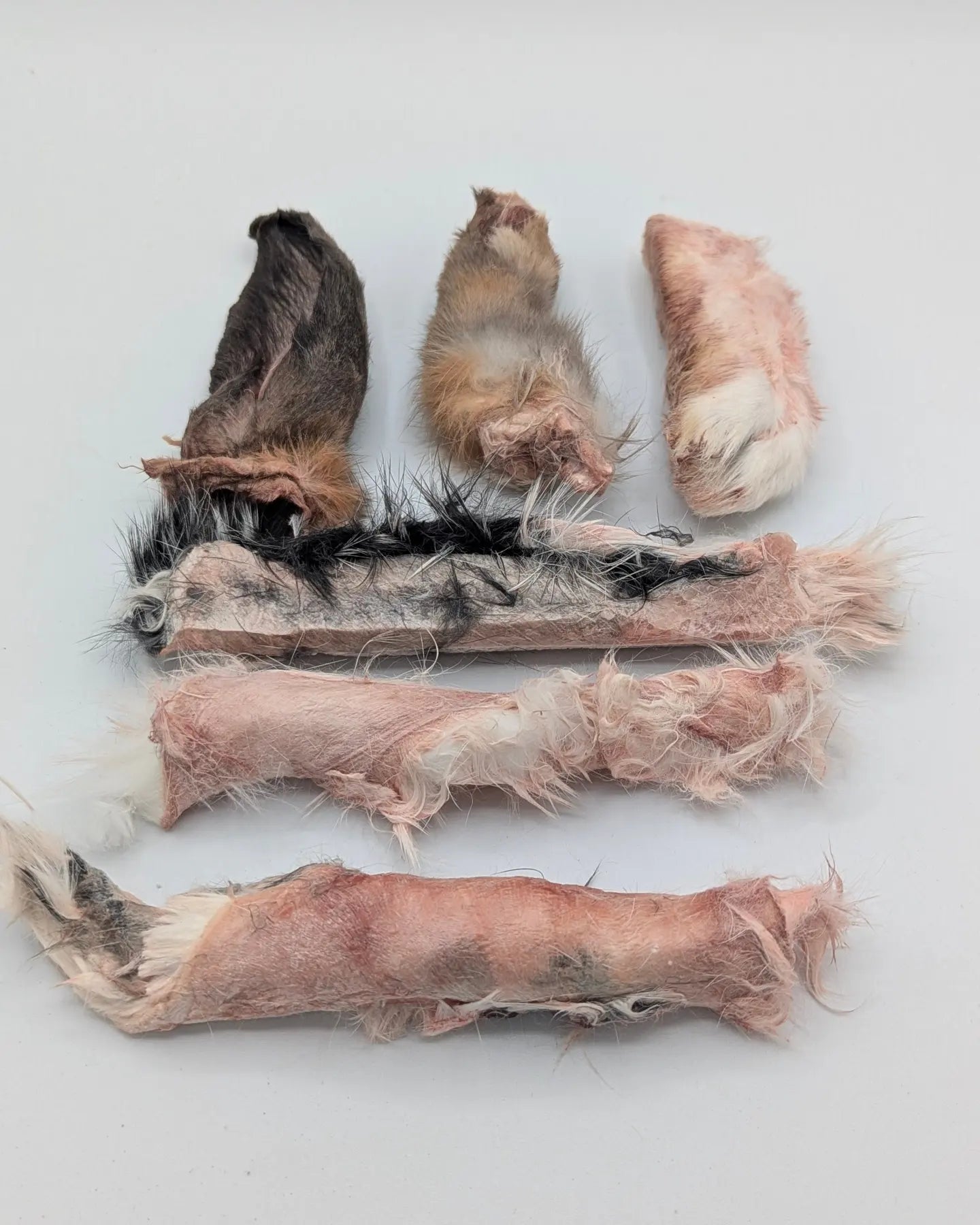 Freeze dried raw rabbit, hide, ear, and feet for your pets!